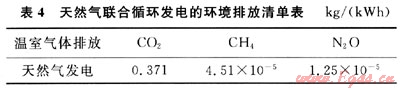 SNG發(fā)電同常規(guī)的天然氣發(fā)電。由于所占比例甚小,在忽略電廠建設用材、電廠建設及退役產生的氣體排放后,參照本文參考文獻[5,9]可得出天然氣聯(lián)合循環(huán)發(fā)電的環(huán)境排放清單,見表4。