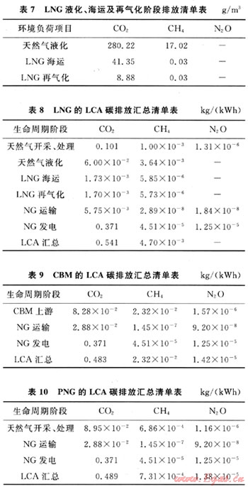 考慮到實際情況和可比性,LNG氣化后的運輸距離按200km考慮,CBM和PNG仍按1000km的運距。由此可以按統(tǒng)一基準編制出LNG、CBM、PNG的LCA碳排放匯總清單,見表8~10。