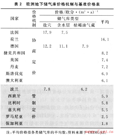 由于成本的差別和采用的定價機制的不同,不但各國地下儲氣庫的價格不同,即使同一個國家,儲氣庫類型不同,價格也有差別,有的甚至還相當(dāng)大。如表2所示,管制定價的儲氣庫價格低于協(xié)商定價,鹽穴儲氣庫的價格高于其他類型的儲氣庫。
