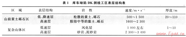 通過小折射、微測(cè)井等多種表層調(diào)查方法,已基本搞清了本工區(qū)內(nèi)表層結(jié)構(gòu)的特點(diǎn)(表1)。準(zhǔn)確的表層模型建立之后,逐點(diǎn)設(shè)計(jì)鉆井深度,保證震源在高速層中激發(fā),增強(qiáng)激發(fā)效果。