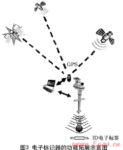 圖3是電子標(biāo)識(shí)器的功能拓展示意圖,由GPS現(xiàn)場(chǎng)記錄電子標(biāo)識(shí)器的經(jīng)度、緯度、海拔高度等信息,將數(shù)據(jù)上傳到電子地圖系統(tǒng),由此記錄標(biāo)識(shí)器所在位置的絕對(duì)坐標(biāo)[4]。