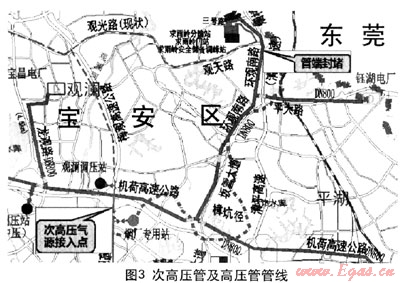 該方案將西氣東輸二線到來(lái)后將使用的天然氣高壓管線與目前的次高壓天然氣管線結(jié)合,利用該段已建好的高壓管線與次高壓管線連接,通過(guò)次高壓管網(wǎng)供應(yīng)電廠。管線情況見(jiàn)圖3。