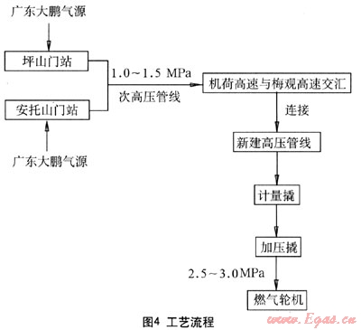 該方案只需煙廠專(zhuān)用調(diào)壓站后的次高壓管線與機(jī)荷高速、坂雪大道、環(huán)觀南路、平大路的高壓管線聯(lián)通,目前只需建設(shè)6.42km,即可聯(lián)通,從工期上來(lái)說(shuō),應(yīng)可以滿(mǎn)足需求。電廠內(nèi)需建設(shè)計(jì)量撬、加壓撬,工藝流程見(jiàn)圖4。