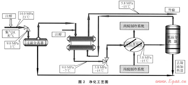 當(dāng)濕天然氣壓力較高或溫度較低時,都易形成天然氣水合物,必須加入天然氣水合物抑制劑。在開工初期,雖然井口溫度較高,但管線溫度場未建立,也有生成天然氣水合物的可能。采用注入甲醇不回收工藝,采用移動注醇車以節(jié)省投資;在凈化工藝的低溫分離段,采用注入乙二醇并回收的工藝,與注甲醇工藝相比,具有占地面積小、投資低、環(huán)境污染小、能耗小、運行費用低等優(yōu)點。
