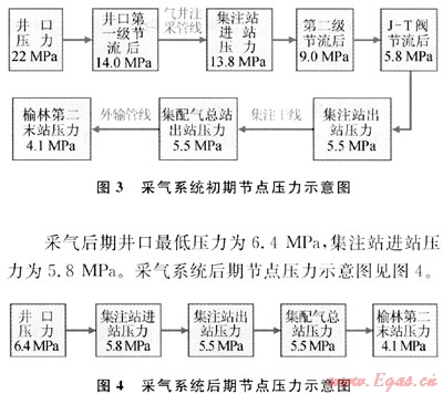 采氣后期井口最低壓力為6.4MPa,集注站進(jìn)站壓力為5.8MPa。采氣系統(tǒng)后期節(jié)點壓力示意圖見圖4。