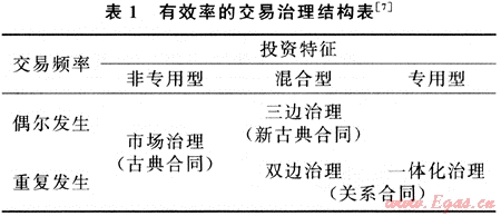 在選擇和設(shè)計(jì)交易治理機(jī)制的時(shí)候,交易者面臨“有限理性困境”和“機(jī)會(huì)主義威脅”兩者之間的持久沖突[6]。交易成本理論提出了有效的交易治理模式:市場(chǎng)治理(非專(zhuān)用型的,通過(guò)市場(chǎng)自由選擇)、一體化治理(專(zhuān)用性很強(qiáng),層級(jí)管理的效率最高)、關(guān)系合同治理(介于兩者之間的關(guān)系合同),如表1所示。