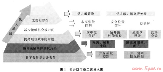 1) 防污染工藝技術(shù)的關(guān)鍵就是采取一系列的工藝技術(shù)措施,“提高頂替效率,防止或減少接觸污染”(圖1)。