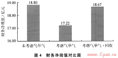 經濟指標為財務內部收益率,財務凈現(xiàn)值,靜態(tài)投資回收期,動態(tài)投資回收期,投資利潤率和投資利稅率[6]。根據經濟指標得出:3種情況的財務內部收益率均大于30%,大于石油財政基準收益率12%;若增添壓縮機,則投資成本能夠在1a內收回;靜態(tài)和動態(tài)投資回收期均小于1a。如圖4,添加壓縮機回收低壓氣比目前壓縮機生產的財務凈現(xiàn)值能多獲得1.45億元。