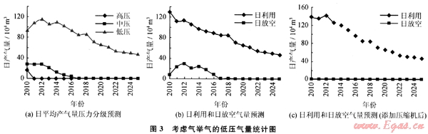 出于經濟考慮,日產氣量低于1×104m3的低壓氣不考慮回收,如果統(tǒng)一添加壓縮能力為20×104m3/d的壓縮機,那么添置情況為2010年1臺,2011年和2012年2臺,2013年1臺,2014年2臺,2015年和2016年1臺。添加壓縮機之后,日利用和日放空氣量預測情況如圖3-c,預計到2025年累計可回收低壓氣為47.26×108m3,比放空方案多回收4.79×104m3。