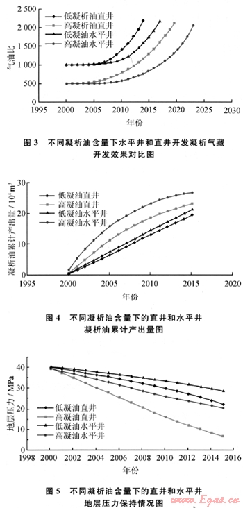 1) 無(wú)論是高凝油地層,還是低凝油地層,水平井的氣油比都比直井的氣油比低,這說(shuō)明用水平井開(kāi)發(fā)凝析氣藏可以減少凝析油損失,提高了凝析油采收率。