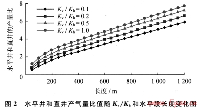 根據(jù)現(xiàn)代油藏工程計(jì)算,某凝析氣藏水平井和直井采氣量比值隨Kv/Kh值和水平段長(zhǎng)度的變化而變化(圖2)。當(dāng)Kv/Kh值為0.2、0.5和水平段長(zhǎng)度為500m的條件下,水平井和直井產(chǎn)氣量比值分別為3.6和4.2。由此可見(jiàn)滲透率非均質(zhì)影響水平井的增產(chǎn)效果。