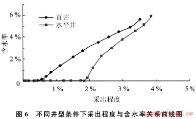 對(duì)于同一個(gè)邊底水油藏,采用不同的井型邊底水推進(jìn)的速度是不一樣的。對(duì)于強(qiáng)底水情況,模擬了圓形地層中心1口直井或1口水平井的開(kāi)采情況,其采出程度與含水率關(guān)系曲線見(jiàn)圖6。從圖中可以看出,水平井的無(wú)水開(kāi)采期比直井的無(wú)水開(kāi)采期長(zhǎng)得多,水平井的采出程度也比直井高。因此同等情況下,水平井的開(kāi)發(fā)效果要好于直井的開(kāi)發(fā)效果。