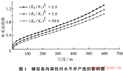通過(guò)對(duì)水平井?dāng)M三維產(chǎn)能方程進(jìn)行離散得出了不同各向異性系數(shù)(水平滲透率與垂向滲透率比值的開(kāi)方)下,水平井長(zhǎng)度和米采油指數(shù)的關(guān)系。
