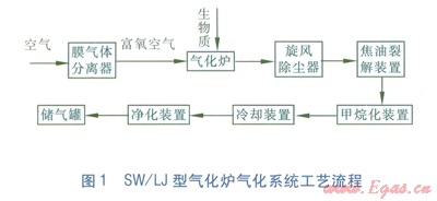 SW/LJ固定床反火型生物質(zhì)氣化爐是生物質(zhì)氣化集中供氣系統(tǒng)的核心,該氣化爐主要功能是把生物質(zhì)等固體原料轉(zhuǎn)換成氣體燃料。具體工藝流程見圖l。生物質(zhì)原料由爐頂送入氣化爐,同時(shí),加入由膜氣體分離器產(chǎn)生的富氧空氣,經(jīng)過熱解氧化和還原反應(yīng),產(chǎn)生的燃?xì)庀冗M(jìn)入旋風(fēng)除塵器分離出燃?xì)庵休^大的顆粒飛灰,然后進(jìn)入焦油裂解裝置,對(duì)焦油進(jìn)行深度裂解;而后,生物質(zhì)燃?xì)膺M(jìn)入甲烷化裝置進(jìn)行反應(yīng);之后再經(jīng)過冷卻裝置使氣體迅速降至室溫;最后,經(jīng)凈化裝置過濾即可得到清潔燃?xì)?,成品燃?xì)膺M(jìn)入儲(chǔ)氣罐儲(chǔ)存。