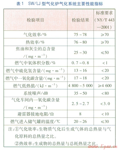 該氣化爐氣化系統(tǒng)穩(wěn)定運(yùn)行后,依據(jù)NY/T443-2001《秸稈氣化供氣系統(tǒng)技術(shù)條件及驗(yàn)收規(guī)范》對(duì)該系統(tǒng)進(jìn)行檢測,主要技術(shù)性能指標(biāo)見表1。