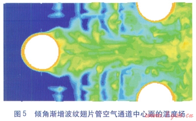 空氣進(jìn)口速度為4m/s時(shí),兩種波紋翅片管空氣通道中心面的溫度場(chǎng)分別見(jiàn)圖4、5。由圖4、5可知,兩種波紋翅片管的溫度分布都很紊亂且成狹長(zhǎng)帶狀。在迎風(fēng)側(cè),傾角漸增波紋翅片管空氣通道中心面空氣溫度上升得較快,且出口溫度高于均勻傾角波紋翅片管。這是由于傾角漸增波紋翅片結(jié)構(gòu)加強(qiáng)了氣流擾動(dòng),從而強(qiáng)化了換熱。兩種波紋翅片管的共同點(diǎn)是:在迎風(fēng)側(cè),溫度場(chǎng)分布稠密,溫度上升較快,換熱較強(qiáng)烈;在背風(fēng)側(cè),溫度場(chǎng)分布稀疏,溫度變化較小,換熱較平緩。