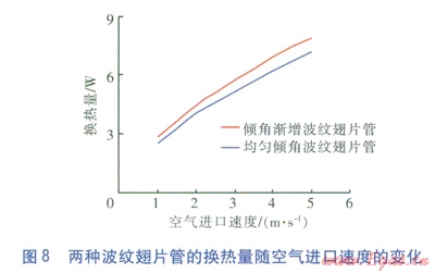 兩種波紋翅片管的換熱量隨空氣進(jìn)口速度的變化見(jiàn)圖8。由圖8可知,兩種波紋翅片管的換熱量隨空氣進(jìn)口速度的增大而增加,換熱量與空氣進(jìn)口速度近似為線性關(guān)系。在相同工況下,傾角漸增波紋翅片管的換熱效果優(yōu)于均勻傾角波紋翅片管。