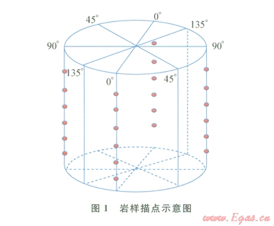 選取渝東南下志留統(tǒng)龍馬溪組露頭巖樣,通過(guò)巖樣軸心逆時(shí)針作0°,45°,90°,l35°共4條過(guò)原點(diǎn)的直線,并延長(zhǎng)至徑向,再根據(jù)巖樣的長(zhǎng)度在軸向做間隔相等的5~10個(gè)點(diǎn)(圖1)。接下來(lái),用縱波探頭測(cè)量巖樣各點(diǎn)的縱波時(shí)差。最后,選擇徑向縱波時(shí)差相差不大的大巖樣(可近似為橫向各向同性的模型)作為研究取心對(duì)象。