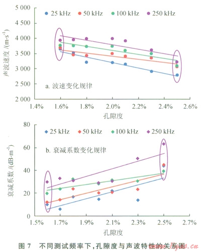 2.2.3不同測(cè)試頻率下,孔隙度對(duì)聲波特性的影響