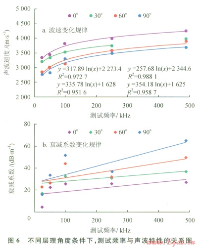 實(shí)驗(yàn)結(jié)果表明,隨著測(cè)試頻率增加,聲波波速也增大,并且呈對(duì)數(shù)正相關(guān)性(圖6-a),頻散現(xiàn)象明顯,在不同層理角度條件下的各組巖心統(tǒng)計(jì)結(jié)果非常吻合,具有很強(qiáng)的規(guī)律性。而聲波衰減系數(shù)隨著測(cè)試頻率的增加總體也呈增大的趨勢(shì)(如圖6-b),但是變化幅度規(guī)律性不強(qiáng),同層理角度條件下的各組巖心統(tǒng)計(jì)結(jié)果相近。該結(jié)果對(duì)于儲(chǔ)層評(píng)價(jià)中聲波參數(shù)的選擇具有一定的指導(dǎo)意義。