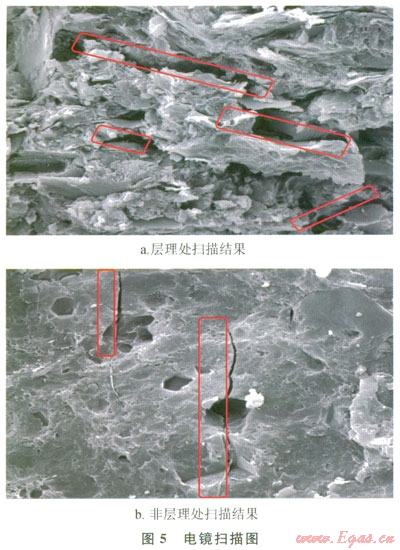 頁(yè)巖的層理發(fā)育方向是研究和表征層理最重要的參數(shù)之一。對(duì)頁(yè)巖進(jìn)行電鏡掃描(圖5)可知,層理面處的膠結(jié)物較多,黏土礦物的產(chǎn)狀相對(duì)比較混亂,且相對(duì)非層理處的微裂縫更加發(fā)育,可知層理面的存存減小了波速,增加了衰減。因此,圖4-a中出現(xiàn)了波速在層理為90°時(shí)要遠(yuǎn)小于層理為0°時(shí)的情況。層理角度變大、衰減增加是由于角度越大,聲波穿透的層理數(shù)增加所致,孔隙度增加層理面的微裂縫數(shù)也會(huì)增加,因此出現(xiàn)圖4-b所示的增加規(guī)律。利用上述規(guī)律,可以綜合利用聲波資料進(jìn)行儲(chǔ)層評(píng)價(jià),對(duì)層理角度進(jìn)行預(yù)測(cè)。