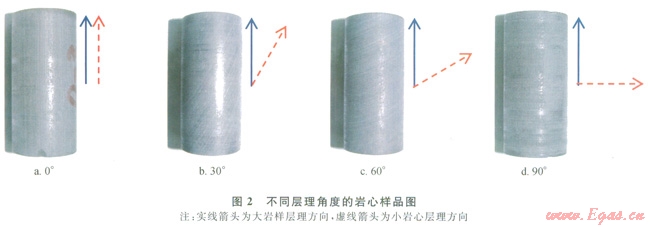 在此基礎(chǔ)上,分別沿平行層理方向(圖2-a)、與對(duì)稱軸呈一定角度(30°、60°,如圖2-b,2-c)、垂直于平行層理方向(圖2-d)進(jìn)行小巖心鉆取,利用鉆機(jī)控制層理角度誤差小于5%,為了不影響測(cè)試效果,所切制樣品直徑均在1英寸左右(25.4mm),長(zhǎng)度介于37.87~51.11mm,兩端面磨平拋光。