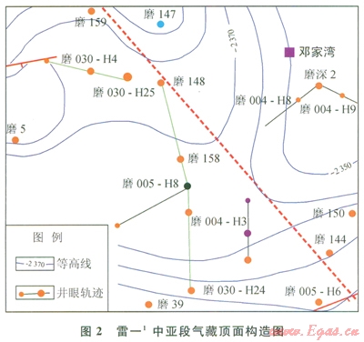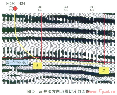 030-H24井井眼軌跡方向上已完鉆的磨39、158、147井連線顯示,雷一1中亞段氣藏的頂面深度在海拔-2370m附近(2),磨39井位于構(gòu)造低點(diǎn)附近。設(shè)計(jì)井眼方向(近正南方)造斜著陸井段和水平段前段構(gòu)造較為平緩,但水平段后段構(gòu)造相對(duì)變陡。磨030-H24井井眼方向的三維地震切片剖面(3),通過(guò)剖面分析看出,著陸井段所處位置地層平緩,傾角近于水平,實(shí)鉆過(guò)程中可能不會(huì)出現(xiàn)較大的地層傾角變化。