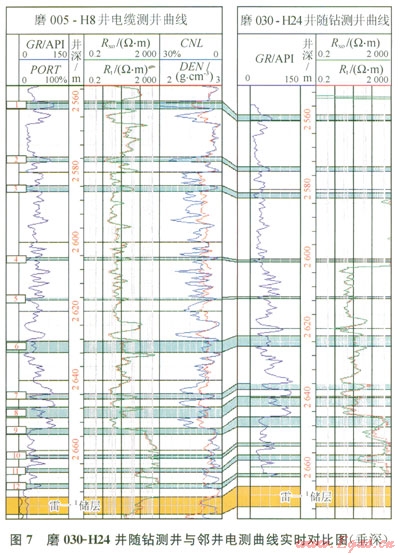 1是磨溪?dú)馓锬?span lang="EN-US">030-H24井的隨鉆測(cè)井與電纜測(cè)井伽馬和電阻率曲線的對(duì)比圖,從圖l中可以看出隨鉆測(cè)井與電纜測(cè)井伽馬和電阻率值均具有良好的相關(guān)性,曲線形態(tài)相同,對(duì)比性好,但電阻值由于標(biāo)定及測(cè)量環(huán)境不同的原因,值的大小有一定差異。值得注意的是由于感應(yīng)電阻率主要應(yīng)用于低電阻率地層,在電阻率較低時(shí)具有較高的測(cè)量精度,當(dāng)?shù)貙与娮杪食^(guò)較高(大于l00W·m)時(shí),測(cè)量精度下降,曲線容易發(fā)生畸變,如圖l中高電阻率地層隨鉆電阻率較大幅度低于電纜測(cè)井電阻率,因此在實(shí)際應(yīng)用時(shí)應(yīng)特別注意其對(duì)分層造成的不利影響。