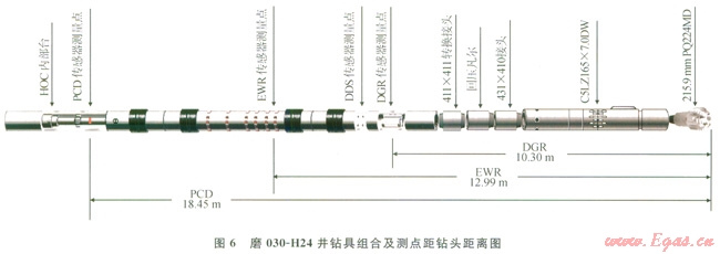 4為磨39、158井和l47井的測(cè)井曲線解釋的云巖儲(chǔ)層,有效厚度約6m,儲(chǔ)層分布穩(wěn)定。儲(chǔ)層特征主要如下:巖性為針孔白云巖、自然伽馬值較低在2030API、電阻率處于相對(duì)低值l0300W·m。儲(chǔ)層上部為泥質(zhì)云巖、泥質(zhì)灰?guī)r和膏巖,特別是儲(chǔ)層上部有約2m垂厚的石膏,其伽馬特征為低值在9API左右,電阻率大于2000W·m,且?guī)r屑錄井上也很好區(qū)分。綜上所述,磨030-H24井連井剖面曲線對(duì)比特征及巖性差異明顯,追蹤性強(qiáng),這些特征可用于鉆井井眼軌跡進(jìn)入儲(chǔ)層頂準(zhǔn)確著陸的技術(shù)控制。