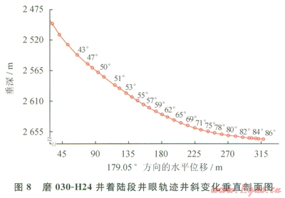 5)鉆進(jìn)至斜深2754m(垂深2659.5m)時(shí),根據(jù)曲線對(duì)比,預(yù)計(jì)后續(xù)地層不會(huì)有太大的變化。經(jīng)過(guò)重新進(jìn)行軌跡優(yōu)化設(shè)計(jì)后,考慮到垂深26632665m為石膏層,井眼軌跡將需要穿越約20m斜深的石膏層(該石膏層定向容易粘卡,該地區(qū)如磨030-H30井等多口井在此層段定向時(shí)發(fā)生過(guò)卡鉆事故),且此時(shí)鉆井液密度已高達(dá)2.02gcm3。因此經(jīng)綜合考慮,將造斜率提高至7°30m8°30m,提前將井斜增至80°,這樣下部井段造斜率要求僅需不到4°30m,考慮到復(fù)合鉆進(jìn)自然增斜率3°30m4°30m。因此下部?jī)H需少量定向增斜即可達(dá)到要求,極大地降低了在石膏層中定向造斜所帶來(lái)的風(fēng)險(xiǎn)。