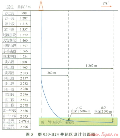 根據(jù)本井鄰井儲(chǔ)層深度、厚度、地層傾角變化分析,地質(zhì)提出了本井井眼軌跡基本要求:以井口為原點(diǎn),定向方位178°,靶前位移362m時(shí)進(jìn)入A點(diǎn),在雷一1中亞段第一儲(chǔ)層完成水平段長(zhǎng)1000m,設(shè)計(jì)全井井深(斜深)3890m(3、5)。