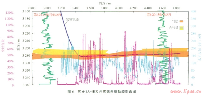 蘇里格氣田儲層含氣砂體薄,傾角變化大,LWD測點監(jiān)測儲層信息滯后于鉆頭位置,實鉆過程中井眼軌跡調整頻繁,砂體有效鉆遇率低。為提高氣層有效鉆遇率,提高鉆井速度,針對軌跡控制難題,通過鉆具力學分析與儲集砂體走向評價,改變了以往的鉆具組合,實施近鉆頭測量[14],形成了精確監(jiān)控、緩慢糾偏、斜有余地、穩(wěn)斜探頂”的軌跡控制技術。該項技術能夠及時掌握實鉆軌跡,并根據(jù)地質提示提前做出調整,避免軌跡大幅度變化,降低了軌跡控制難度,提高了砂體有效鉆遇率,縮短了鉆井周期。2010年該技術在蘇61A-4HX井應用,實現(xiàn)了砂層鉆遇率85.6%,氣層(含氣層)鉆遇率67.6%的突破(6)。2011年該技術在蘇里格氣田實現(xiàn)規(guī)模應用,先后鉆井l63口,平均砂巖鉆遇率81.4%,氣層(含氣層)鉆遇率65.5%。