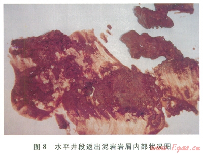 該體系2011年開始在水平井規(guī)模推廣,現(xiàn)場應用累計超過80井次,平均縮短水平井段施工周期58d,應用效果表明,無土相暫堵鉆()井液體系潤滑防卡性能好、低剪切速率下攜屑能力強,返出H泥巖巖屑內部呈干態(tài),表明抑制性良好,未出現(xiàn)吸水膨脹現(xiàn)象(8)。