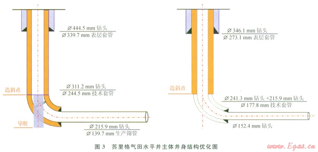 針對蘇里格氣田水平井Æ311.2mm鉆頭機械鉆速低、Æ203mm螺桿造斜率小、斜井段施工周期長、井壁穩(wěn)定性差等難題,通過理論研究和現(xiàn)場試驗,并參考井身結構設計方法[8]中套管與井眼之間環(huán)空的合理間隙[9],優(yōu)化形成蘇里格氣田水平井的彥273.1mmׯ177.8mm×裸眼的主體井身結構(3),表層井眼尺寸由Æ444.5mm優(yōu)化為Æ346.1mm,第二次開鉆使用尺寸Æ241.3mm的鉆頭鉆至造斜點,取消了導眼段,斜井段再采用Æ215.9mm鉆頭鉆至入窗點,下入Æ177.8mm技術套管,水平段優(yōu)化為Æl52.4mm井眼。