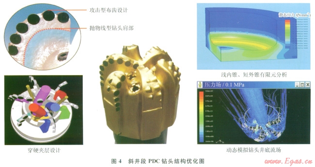 對其模擬定向鉆進有限元力學分析表明,在一定的鉆壓下,短外錐的PDC鉆頭受力均勻,拋物線形鉆頭肩部外形的連續(xù)性過渡可消除集中點載荷,這更有利于PDC鉆頭的穩(wěn)定性。外錐短拋物線可以減小鉆頭與井壁的接觸面積,從而減小鉆頭與井壁之間的摩擦力,減輕鉆頭與井壁摩擦導致的鉆頭渦動,提高了鉆頭定向反應靈敏度。攻擊型布齒設計既保證鉆頭能吃入硬夾層,且鉆頭鉆出硬夾層時切削齒不損壞。此外,增加鉆頭鼻部至保徑部分切削齒的投影密度,有利于保護切削齒,增強鉆頭穿硬夾層的能力和加強保徑的能力。在斜井段施工過程中,這種結構的PDC鉆頭在較小的鉆壓下就能獲得比常規(guī)PDC鉆頭更高的鉆速,同時由于扭矩較小,鉆頭穩(wěn)定性強,工具面更加穩(wěn)定,使斜井段平均機械鉆速、單只鉆頭進尺與壽命大幅提高。
