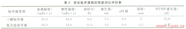 通過對石千峰組、石盒子組地層坍塌機理研究,從強化封堵、抑制膨脹和力學平衡三方面進行攻關,研制出CQSP-X強抑制無土相復合鹽鉆井液體系。體系配方為:1.5SFT-1+1SMP-2+0.3CMC(PAC)+0.5HL60+0.2NaOH+0.5CMS+4%~5QS4+10%~l5KCI+10WT-l。其豐要性能與三磺鉆井液體系對比如表2所示??梢钥闯?,體系防塌能力強、潤滑防卡性能好、低剪切速率下攜屑能力強。