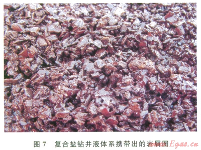 復合鹽鉆井液體系2011年開始在水平井全面推廣,累計應用約100口井,平均縮短斜井段施工周期710d。有效抑制了石千峰組、石盒子組的坍塌,克服了PDC鉆頭泥包、黏卡等施工難題,攜帶出的巖屑棱角分明、形狀規(guī)整、無吸水膨脹,如圖7所示。