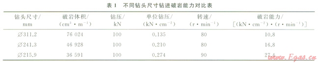 針對蘇里格氣田地層巖心可鉆性分析,并對不同鉆頭尺寸模擬水平井鉆進參數(shù)時的機械破巖能力進行對比,由表l可以看出,Æ2159 mm鉆頭在一定條件下,破巖能力最強。斜井段優(yōu)化為Æ215.9mm井眼可大幅提高機械鉆速。