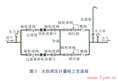 調(diào)壓計(jì)量柜內(nèi)安裝兩路調(diào)壓計(jì)量裝置,在兩路并聯(lián)的前提下增加旁通管將兩路裝置連接?;鹁嬲{(diào)壓計(jì)量柜工藝流程見圖3。燃?xì)庥?jì)量設(shè)施安裝于調(diào)壓器之前,一路采用工況(298.15K,0.26MPa)流量為l000m3/h的渦輪流量計(jì);另一路計(jì)量采用工況(298.15K,0.26MPa)流量為650m3/h渦輪流量計(jì):調(diào)壓器最大流量>4500m3/h。