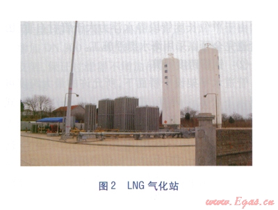 在長輸管道通氣之前,LNG氣化站一直是海陽旅游度假區(qū)的主要?dú)庠?。該氣化站是我公司?span lang="EN-US">2005年作為海陽市招商引資項(xiàng)目投資建設(shè)的(見圖2)。主要設(shè)備有兩臺(tái)l00m3立式LNG儲(chǔ)罐,一臺(tái)2000m3/h空溫式氣化器,一臺(tái)2000m3/h水浴式氣化器,一臺(tái)200m3/h卸車增壓器,一臺(tái)400m3/h的BOG增壓器。日供氣量約10×104m3/d。將LNG氣化站作為氣源三,其出口壓力為0.27MPa,出口管道規(guī)格為SDRll PE80 NOD 250mm,距離火炬調(diào)壓計(jì)量柜約7km,與主氣源一、二配合完全可以滿足火炬高峰用氣量。