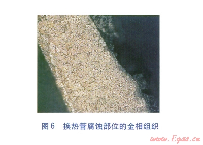 鍍搪瓷鋼管穿入箱體板中,壓板擠壓柔性石墨密封圈,以填充箱體板與換熱管間的填料函起到密封作用。與整體焊接的固定管箱式結(jié)構(gòu)相比,這種結(jié)構(gòu)一是可以削弱換熱管根部承受的交變應(yīng)力,二是可有效避免焊接導(dǎo)致的管道抗腐蝕性能的降低。經(jīng)過技術(shù)改造,使用壽命提高到l0~12個月。雖然技術(shù)改造后空氣預(yù)熱器的使用壽命有了一定延長,但效果仍不理想。通過現(xiàn)場勘察,技術(shù)改造基本杜絕了換熱管主體的酸露點腐蝕,腐蝕主要發(fā)生在換熱管與箱體板、柔性石墨密封圈接觸的部位(見圖5)。通過對換熱管腐蝕部位的金相組織(見圖6)分析發(fā)現(xiàn),腐蝕成因為典型的縫隙腐蝕[3-4]。