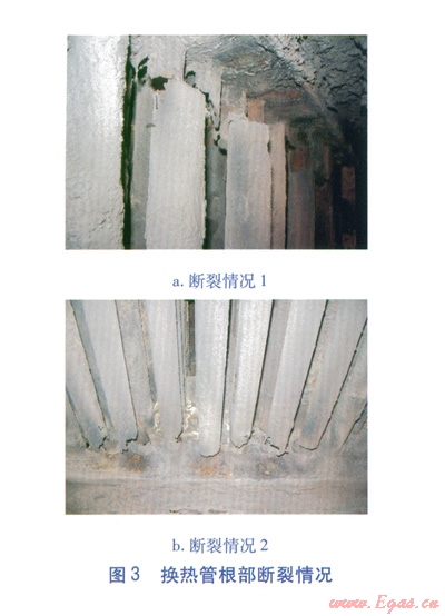 根據(jù)以上分析,課題小組選用抗腐蝕性能較高的ND鋼(09CrCuSb)對換熱管進行改造,仍采用整體焊接的固定管箱式結(jié)構(gòu)。但改造后,5~10個月?lián)Q熱管根部再次出現(xiàn)了斷裂。不但使用壽命沒有有效延長,而且由于ND鋼的價格較高,導(dǎo)致成本急劇增加。