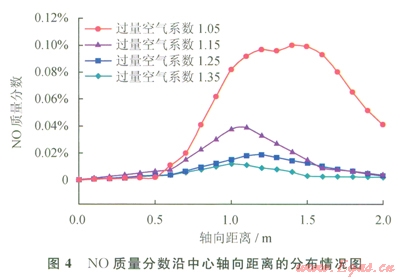 圖4為N0質(zhì)量分?jǐn)?shù)沿中心軸向距離的分布情況,由圖4可知,a為1.05時,NO的峰值最大,其質(zhì)量分?jǐn)?shù)達到0.11%,結(jié)合圖2的溫度分布可知,當(dāng)a為1.05時,具有最高的溫度峰值,較高的溫度會促使熱力型NO的生成量增加;a為1.15時,NO的峰值為0.018%;a為1.25時,NO的峰值為0.039%;a為1.35時,NO的峰值為0.012%,可以看出NO的生成量與燃燒工況的溫度有較大的關(guān)系。NO的質(zhì)量分?jǐn)?shù)隨著軸向距離的增加呈現(xiàn)出先增后減的趨勢,如a為1.05時,在X為1.0~1.6m區(qū)間NO的質(zhì)量分?jǐn)?shù)最高,結(jié)合圖2可知該區(qū)間具有較高的溫度分布。4種過量空氣系數(shù)下爐膛出口處NO的質(zhì)量分?jǐn)?shù)分別為0.0427%,0.00218%,0.000996%,0.000254%,從減少污染物排放的角度考慮,工況4(a為1.35)是最優(yōu)的,產(chǎn)生的NO含量最低。