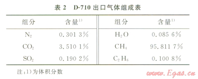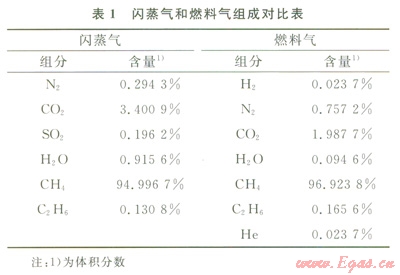 首先利用氣相色譜對閃蒸氣的組成進行了分析,結(jié)果如表l所示。從分析結(jié)果可以看出,其主要成分是CH4,含量為94.9967%(體積分數(shù)),通過表l的對比可以看出,閃蒸氣的組成和燃料氣的組成十分相近。