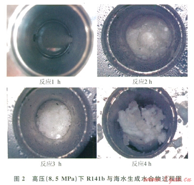 為了考察Rl4lb在深海中(有一定的壓力)與海水生成水合物的過程,筆者選用氮?dú)庾鳛樵黾迎h(huán)境壓力的氣體,主要南于氮?dú)馑衔飿O難生成。將反應(yīng)釜的溫度設(shè)為2℃,加入240 ml。海水及6mL的R141b,密封反應(yīng)釜。通入氮?dú)庵翂毫?span lang="EN-US">8.5MPa,調(diào)節(jié)攪拌子速率為400r/min,進(jìn)行水合物生成反應(yīng),每小時(shí)用相機(jī)記錄下水合物反應(yīng)情況。圖2為觀測(cè)到的R14lb水合物生成過程,可以看出,在4h內(nèi)水合物大量生成,遠(yuǎn)遠(yuǎn)低于在常壓下的反應(yīng)時(shí)間,說明在高壓下R141b可很快地與海水生成水合物。在反應(yīng)過程中,釜內(nèi)壓力不變,依然為8.5MPa,說明氮?dú)鉀]有參與水合物的生成反應(yīng)。