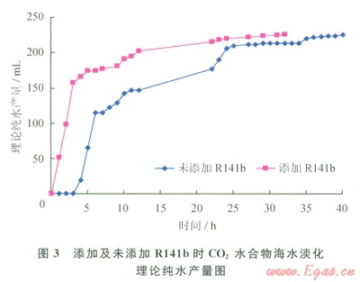 在相同條件下,CO2壓力降低越快,說明CO2水合物反應(yīng)速度越快。對(duì)照兩組相同的實(shí)驗(yàn)發(fā)現(xiàn),添加了Rl41b的實(shí)驗(yàn)比未添加Rl41b的實(shí)驗(yàn)壓力降低的速度明顯加快,如當(dāng)CO2壓力都降為3.7MPa時(shí),前者所需時(shí)間為2h,而后者則需要8h,說明了添加R141b可極大地促進(jìn)CO2水合物的生成速度,從而提高海水淡化效率。