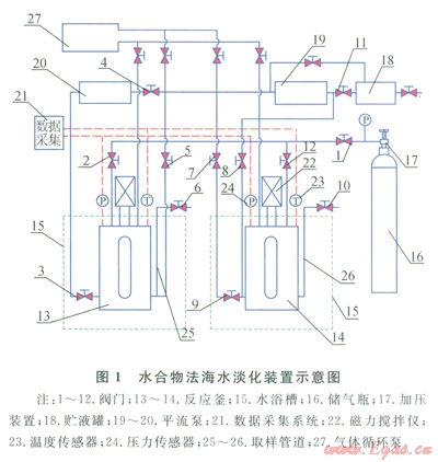 為此,筆者研制了一套水合物法海水淡化實(shí)驗(yàn)裝置[7],采用雙反應(yīng)釜設(shè)計(jì),兩釜之間氣體、液體可以相互流通,可開展海水的逐級(jí)淡化研究。首次將Rl41b作為促進(jìn)劑與CO2氣體結(jié)合起來,大大加快了反應(yīng)速度,探討了水合物法海水淡化操作的最佳條件,以期為該技術(shù)的工業(yè)應(yīng)用提供依據(jù)。