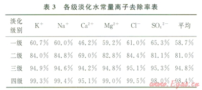 2)對(duì)本方法的海水淡化程度進(jìn)行了分析,海水經(jīng)過多級(jí)淡化,可以獲得了凈化度很高的淡水。在二級(jí)淡化水中,常量離子去除率平均可達(dá)81.0%,而三級(jí)和四級(jí)淡化水的離子去除率則分別達(dá)到了94.8%和98.4%,四級(jí)淡化水所有的離子濃度指標(biāo)均優(yōu)于飲用水標(biāo)準(zhǔn)。