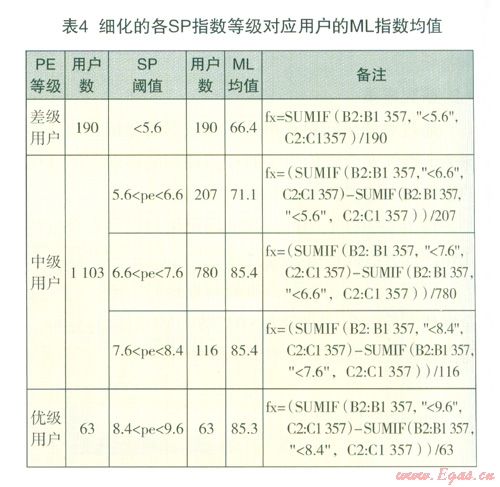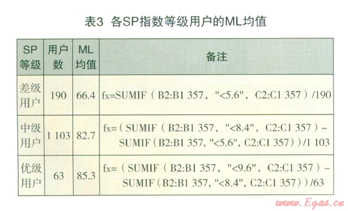 研究方法:對3種SP指數(shù)等級的用戶進行統(tǒng)計,分別計算出ML指數(shù)的平均值,再根據(jù)獲得的結果進行分析。統(tǒng)計采用SUMIF程序。如表3: