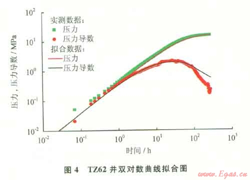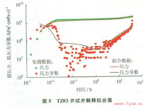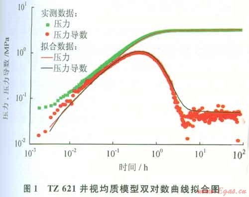 如TZ621井,4851~4885m井段的儲(chǔ)層測井解釋孔隙度為2.66%,巖性為生屑砂屑灰?guī)r,針狀溶孔及小型溶蝕孔洞發(fā)育,主要發(fā)育Ⅱ、Ⅲ類儲(chǔ)層,儲(chǔ)滲綜合評價(jià)為孔洞型。試油期間,開井流動(dòng)曲線近似一條水平直線,呈干層特征;初關(guān)井壓力恢復(fù)較快,表明地層滲透性較好(圖1)。壓裂后,用4.9mm油嘴生產(chǎn),折合日產(chǎn)油103.87m3,折合日產(chǎn)氣47320m3,效果顯著。試井解釋表現(xiàn)出典型的均質(zhì)地層特征。由于廣泛發(fā)育洞穴,且洞穴內(nèi)巖石充填較少,所以此類儲(chǔ)層的滲流條件非常好,試井解釋滲透率為270mD,初期產(chǎn)能高,但穩(wěn)產(chǎn)條件取決于洞穴的彈性空問大小以及與洞穴相連的儲(chǔ)集體儲(chǔ)滲能力的大小。該井自2004年12月8日到2011年3月10日關(guān)井前,累計(jì)產(chǎn)油9.9×104t,累計(jì)產(chǎn)氣4400×104m3。